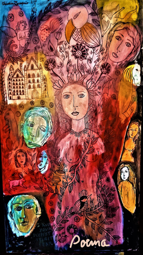 Na espiral do tempo que não retrocede, as pinturas de Cláudia também se ocupam de pensar a vida como um constante painel de expressões poéticas. Há um clamor que vem da necessidade de conferir vez e voz ao canto íntimo de suas personagens, atitude que abre perspectivas em torno do desejo, da serenidade, do caos mundano e do espanto e estranhamento frente ao todo circundante.