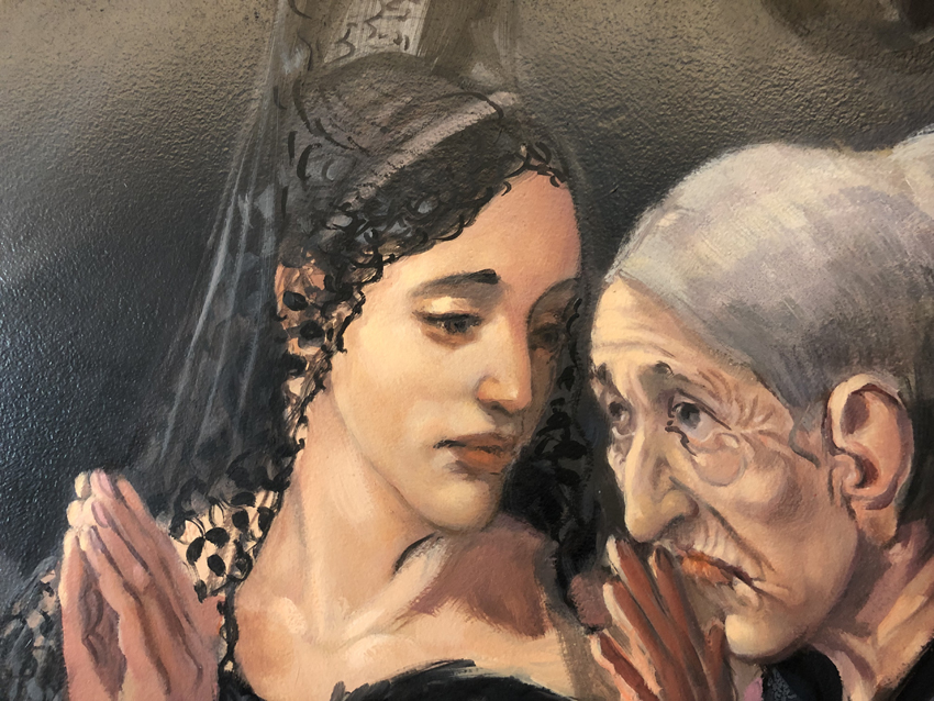 O cenário é deslumbrante. As cadeiras estão dispostas em três lados do retângulo do teatro, e nelas nos distribuímos, como se fôssemos convidados de Nastácia. Ela conversa conosco, dirige-se a nós, nomeia alguns dos espectadores e a participação do público, aqui e ali, também tornam o espetáculo mais leve, pois essas se tornam passagens engraçadas. No alto, uma miríade de molduras de quadros e retratos, em sua maioria vazios, mas alguns deles com cenas e personagens em posições de morte. No centro da cena, as mesas com os quitutes da festa – os acepipes – cadeiras e alguns objetos curiosos. Nastácia está se preparando para a festa que, logo mais, irá acontecer.